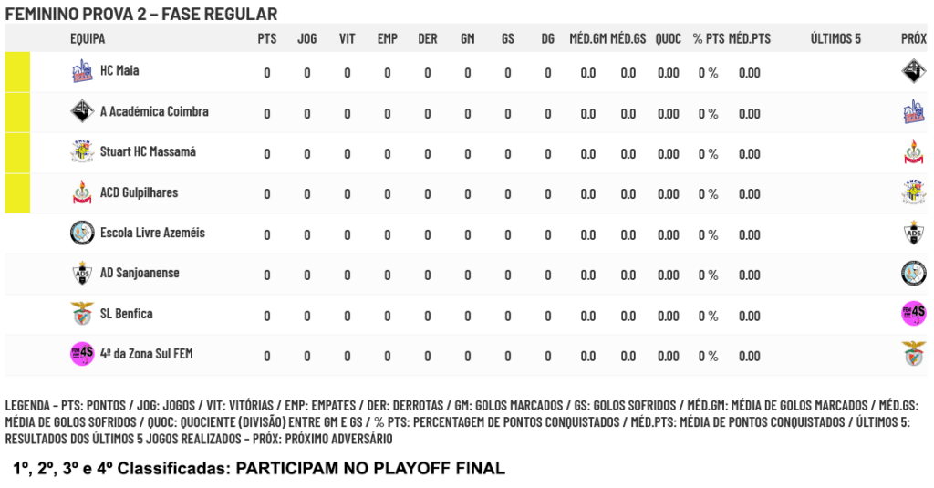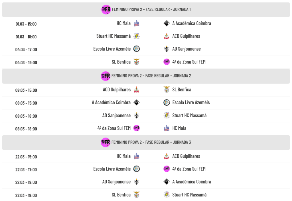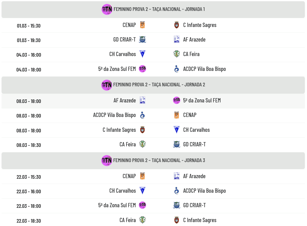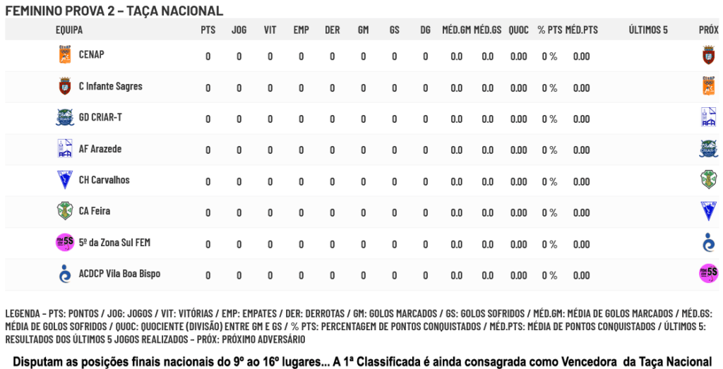 Calendários da Prova 2 do Campeonato Nacional Feminino
