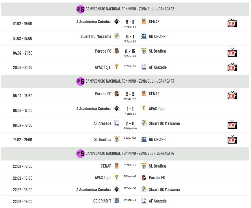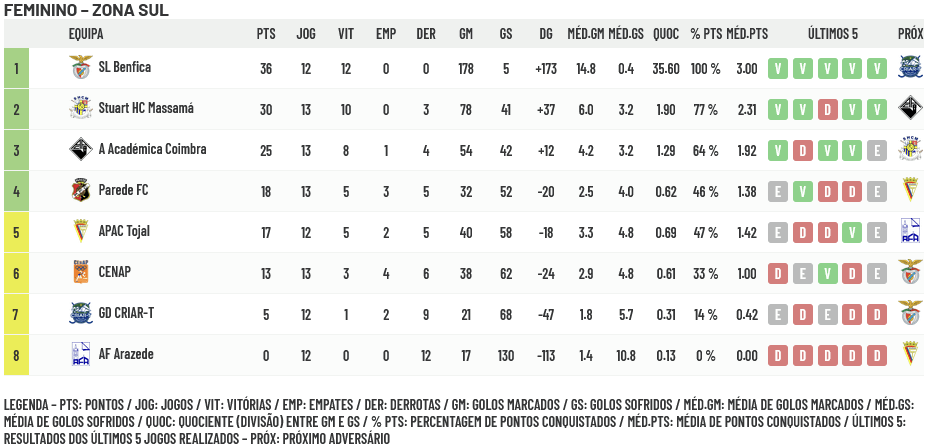 Na Zona Sul, Benfica, Stuart Massamá e Académica de Coimbra já estão matematicamente apurados e a única dúvida reside na 4ª equipa que as acompanhará na participação da Fase Regular, sendo que só Parede e Tojal estão ainda na luta pela última posição de apuramento. O Parede tem 1 ponto a mais que o Tojal na tabela da Classificação Geral atual mas as tojalenses têm 1 jogo a menos (com o Arazede) e podem chegar à jornada final empatadas ou com mais dois pontos que o seu adversário direto…