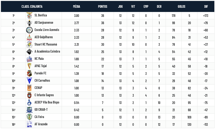Se atentarmos ao quadro abaixo, verificamos que o Parede só tem mais o jogo com o Tojal, na última jornada, enquanto o Tojal vai encontrar o Arazede e receberá em São Julião do Tojal o Parede no último jogo desta fase. A verdade é que estará muita coisa em jogo na partida entre eles da Jornada 14, ou seja, definirá a presença na próxima fase em posição de disputa do título ou a “queda” para um torneio de consolação que definirá posições da 9ª à 16ª, sendo que o Tojal terá a seu favor o facto de jogar no seu pavilhão e poderá, à data, ter mais dois pontos que o Parede, sendo-lhes suficiente o empate. O melhor mesmo é esperar pelo Tojal-Arazede em atraso da jornada 12 e depois teremos um quadro mais bem definido.