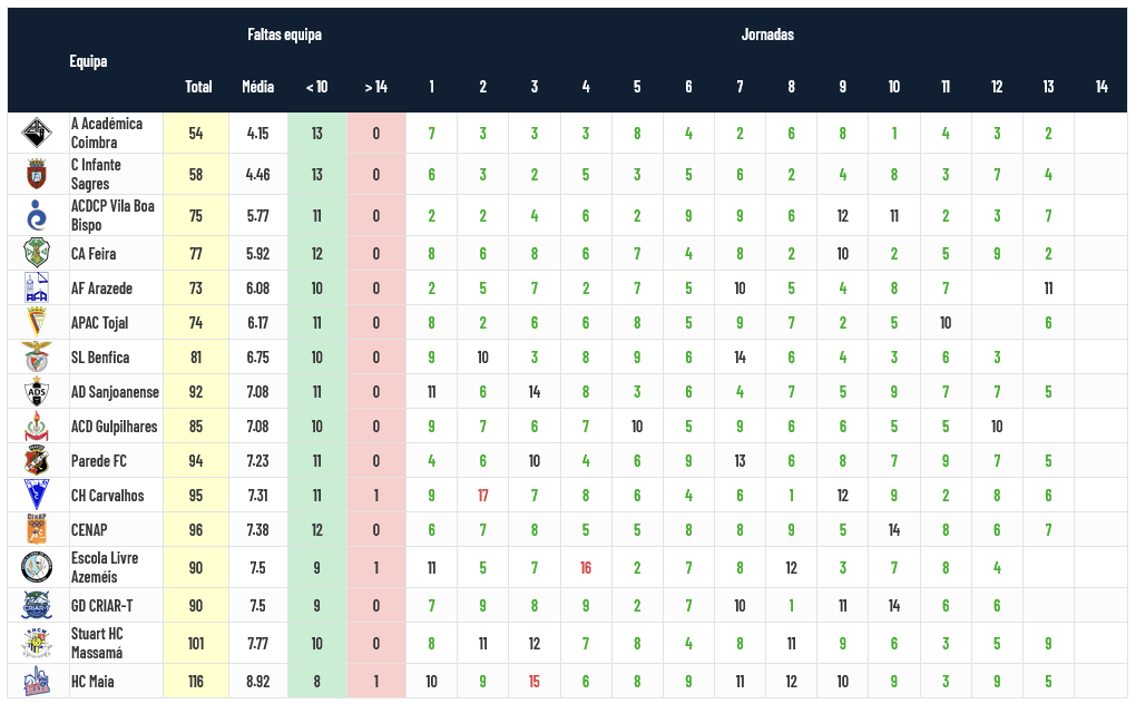 A Académica de Coimbra é a equipa que menos Faltas de Equipa comete em média (4,15 por jogo), com o Infante Sagres logo a seguir (4,46 por jogo) e o Vila Boa do Bispo (5,77 por jogo).