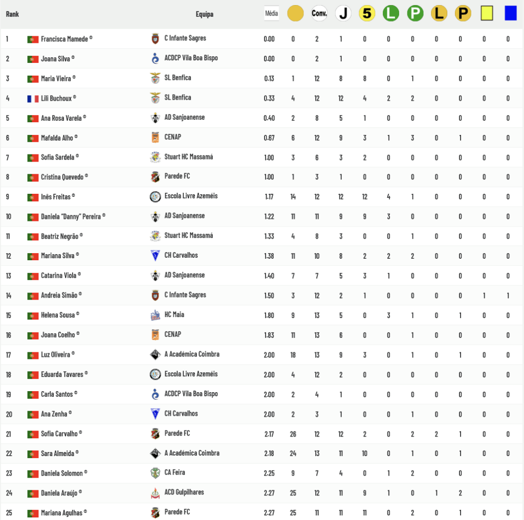 Maria Sofia Silva é a líder completamente destacada da lista de goleadoras com 47 golos mascados, mais 20 do que a sua mais direta perseguidora, Ana Patrícia Fernandes, e mais 21 da sua companheira de equipa Inês Severino.