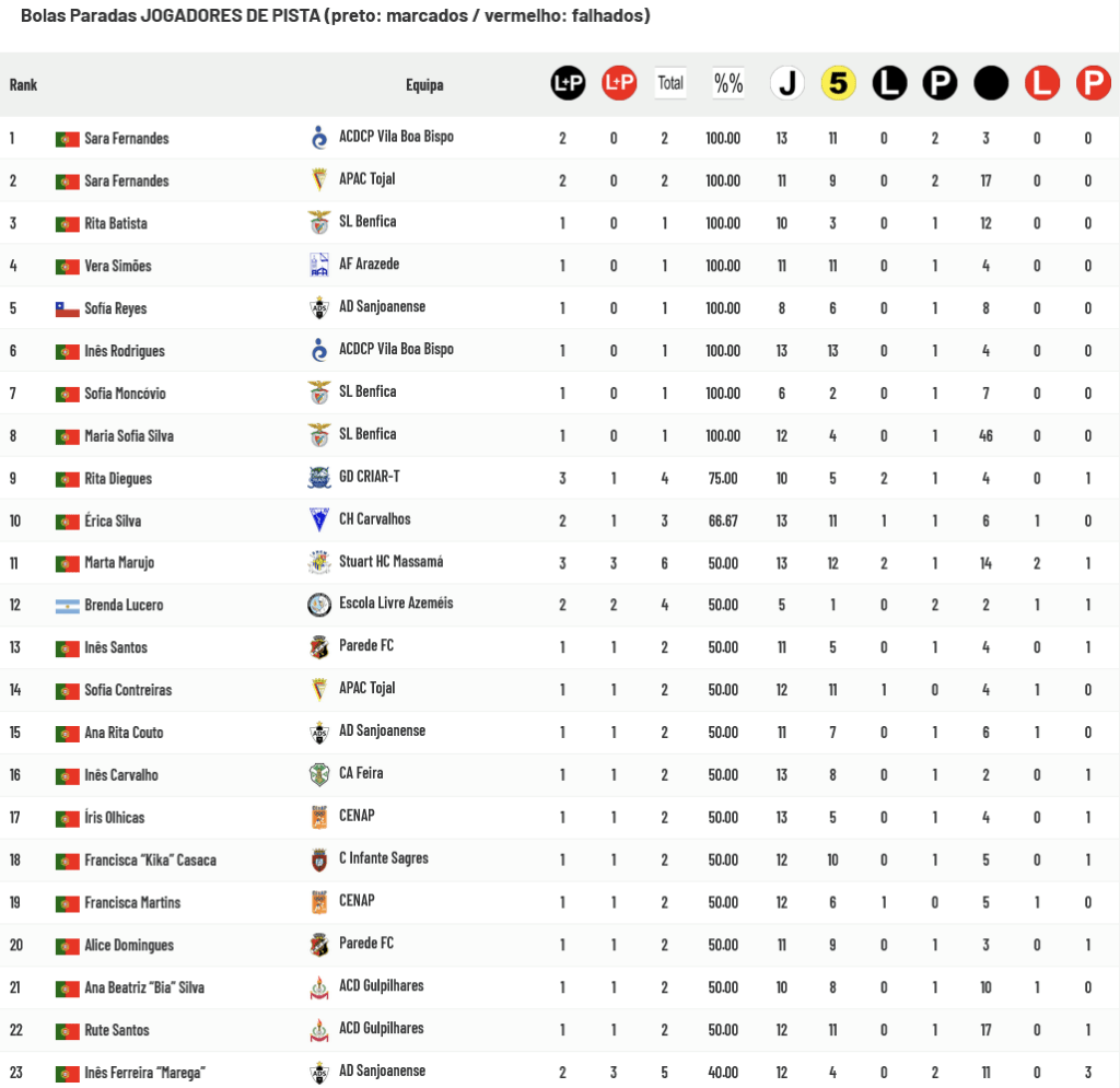No Campeonato Nacional Feminino são 8 as jogadoras que ainda não falharam a transformação de Livres Diretos ou Grandes Penalidades e somente 14 as que conseguem transformar metade ou mais das situações disponíveis.