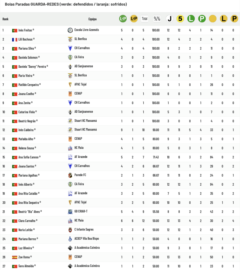 Quando se trata das Guarda-Redes, somente 11 ainda não sofreram qualquer golos na defesa de transformação de Livres Diretos ou Grandes Penalidades e são 27 as que conseguem defender metade ou mais das situações a que foram sujeitas.
