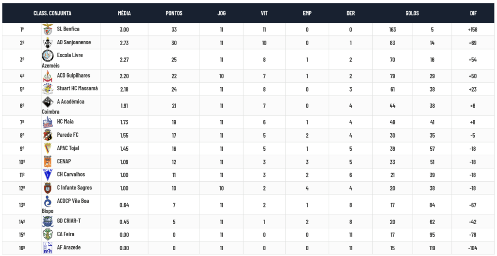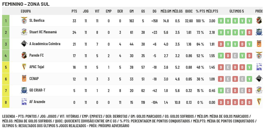 Na Zona Sul o Benfica já está matematicamente apurado e o Stuart Massamá necessita somente de 1 ponto para obter vantagem definitiva sobre o Tojal, atual 5º classificado. A verdade é que o Stuart ainda vai jogar com CRIAR-T (7º classificado) e Arazede (8º classificado somente com derrotas) e parece-me (pela lógica) que conseguirá com mais ou menos dificuldade o ponto necessário ou até não, atendendo a que o Tojal terá de vencer todos os jogos e um deles não é necessariamente fácil porque irá defrontar a Académica em Coimbra. A Académica de Coimbra tem 5 pontos de avanço sobre o Tojal mas na verdade tem 8 porque Tojal e Parede jogam entre si na 14ª jornada e 1 deles perderá pontos, mas se esperarmos pela jornada 13 teremos um confronto entre Académica e Tojal e tudo poderá então ficar decidido… ou não!!! Parece-me que a questão, na Zona Sul, é saber quem vai ceder, Parede ou Tojal, que me parecem as duas equipas que realisticamente lutarão pelo 4º lugar, último que dará apuramento.