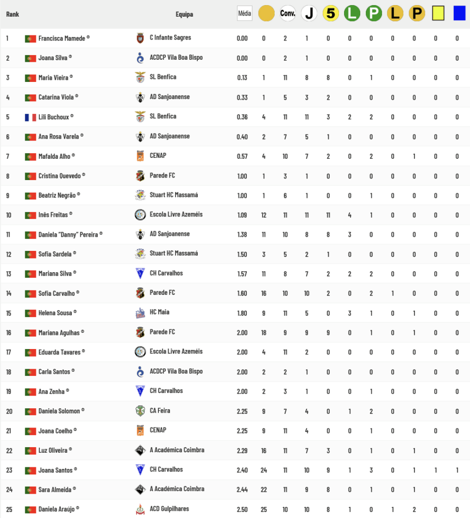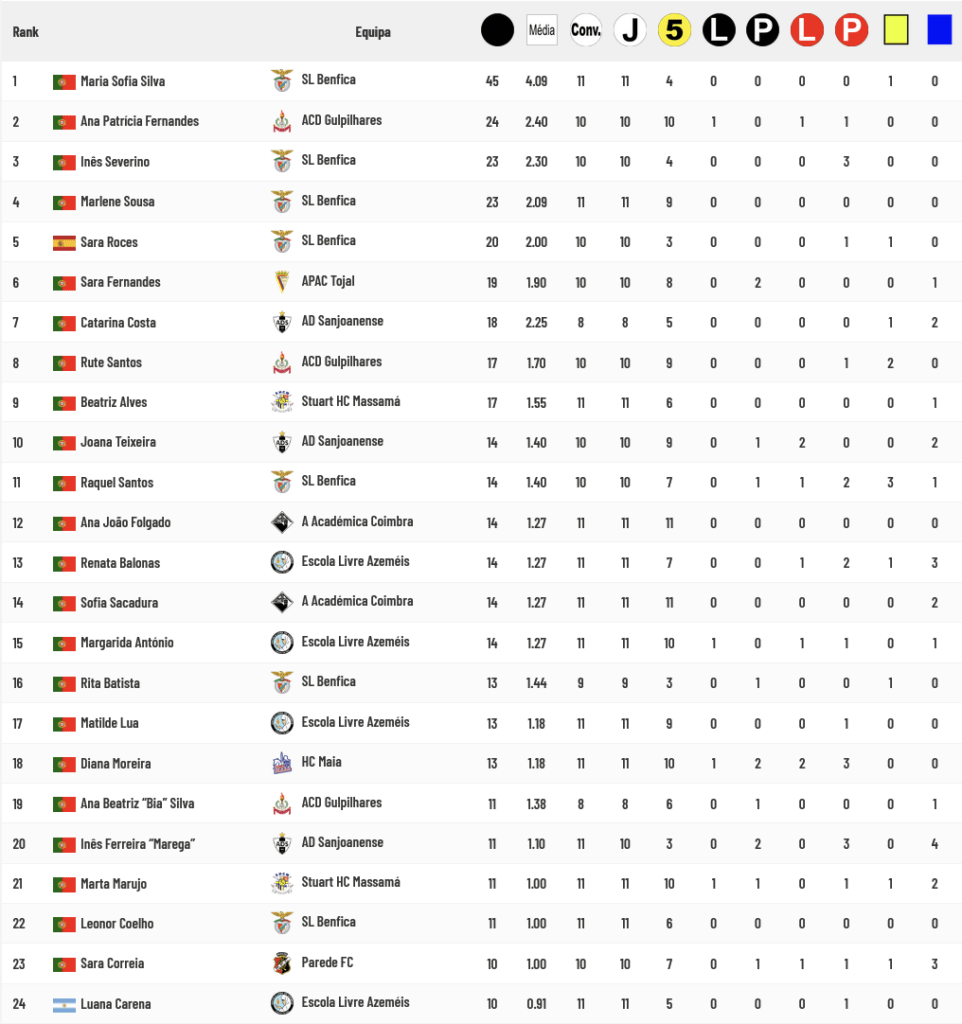 Maria Sofia Silva é a líder completamente destacada da lista de goleadoras com 45 golos, mais 21 do que a sua mais direta perseguidora, Ana Patrícia Fernandes, e das suas companheiras de equipa que ocupam as 3 posições seguintes, Inês Severino, Marlene Sousa e Sara Roces.