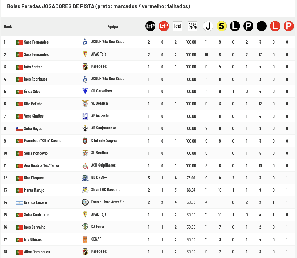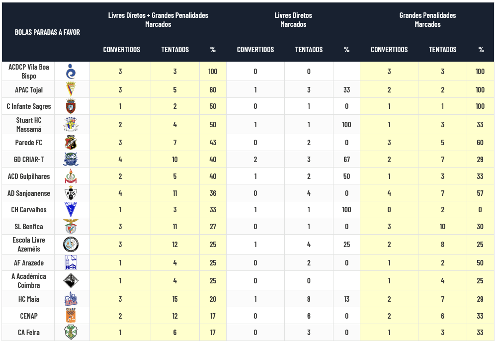 As jogadoras do Vila Boa do Bispo ainda não falharam na tentativa de transformação das Bolas Paradas e somente as do Tojal (60% de sucesso), Infante Sagres e Stuart Massamá (50% de sucesso) conseguem mais de metade de golos nas situações disponíveis.