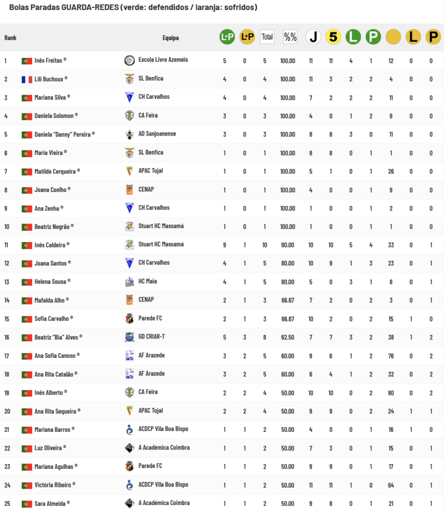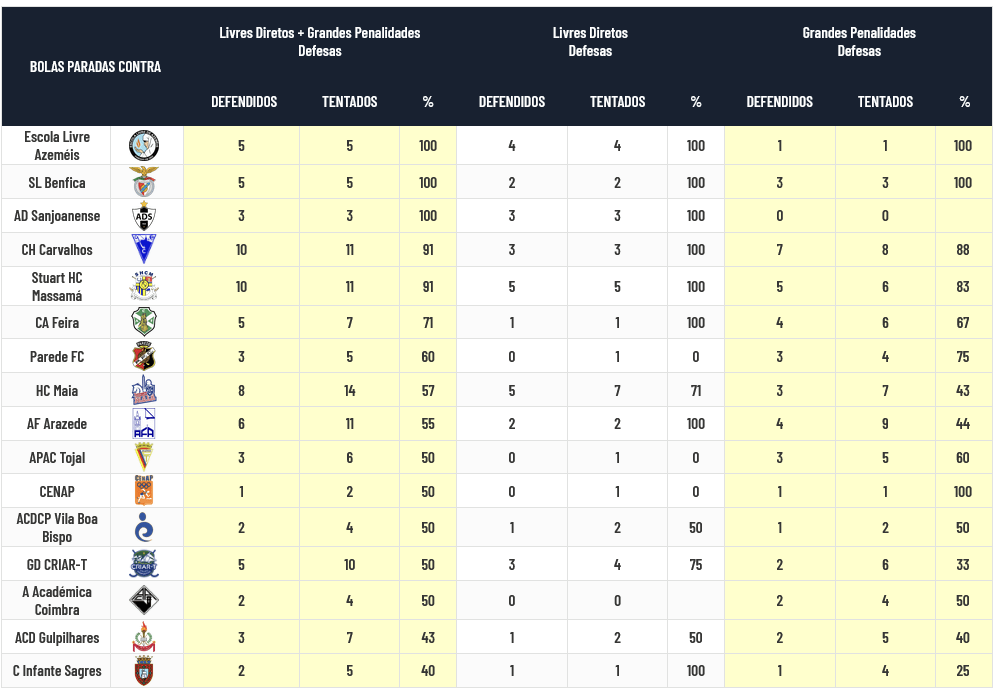 No que concerne às Guarda-Redes, as do Escola Livre, Benfica e Sanjoanense ainda não sofreram qualquer golo em situação de Bola Parada mas as de Carvalhos e Stuart Massamá apresentam também valores excelentes (91% de defesas). Somente 9 equipas têm guarda-redes que defendem mais de metade das situações a que são sujeitas.