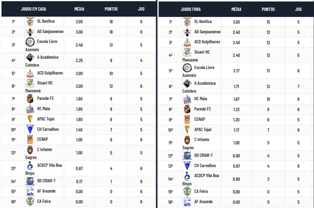 Benfica e Sanjoanense não perdem jogos “em casa” e somente o Benfica consegue vencer todos os jogos “fora de casa”