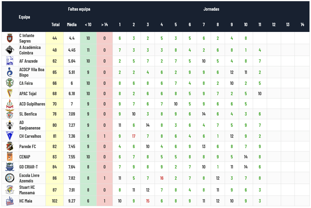 O Infante Sagres é a equipa que menos Faltas de Equipa comete em média (4,40 por jogo), com a Académica de Coimbra logo a seguir (4,45 por jogo) e o Arazede (5,64 por jogo).