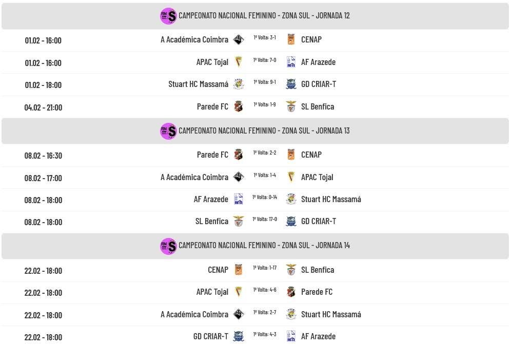 Se atentarmos ao quadro abaixo, verificamos que o Parede ainda vai defrontar o invencível Benfica, o CENAP e… o Tojal, na última jornada, enquanto o Tojal vai encontrar o Arazede, a Académica e receberá em São Julião do Tojal o Parede no último jogo desta fase. Pela lógica, o calendário do Tojal parece bem mais acessível que o do Parede mas até pode tudo ser diferente e a Académica ainda ser “sugada” para este confronto. Quem não parece ter já qualquer hipótese é o CENAP que ainda defrontará Académica e… Benfica. Deixemos tudo “por conta” das equipas e quem for mais forte será, certamente, quem seguirá em frente na procura de um título nacional