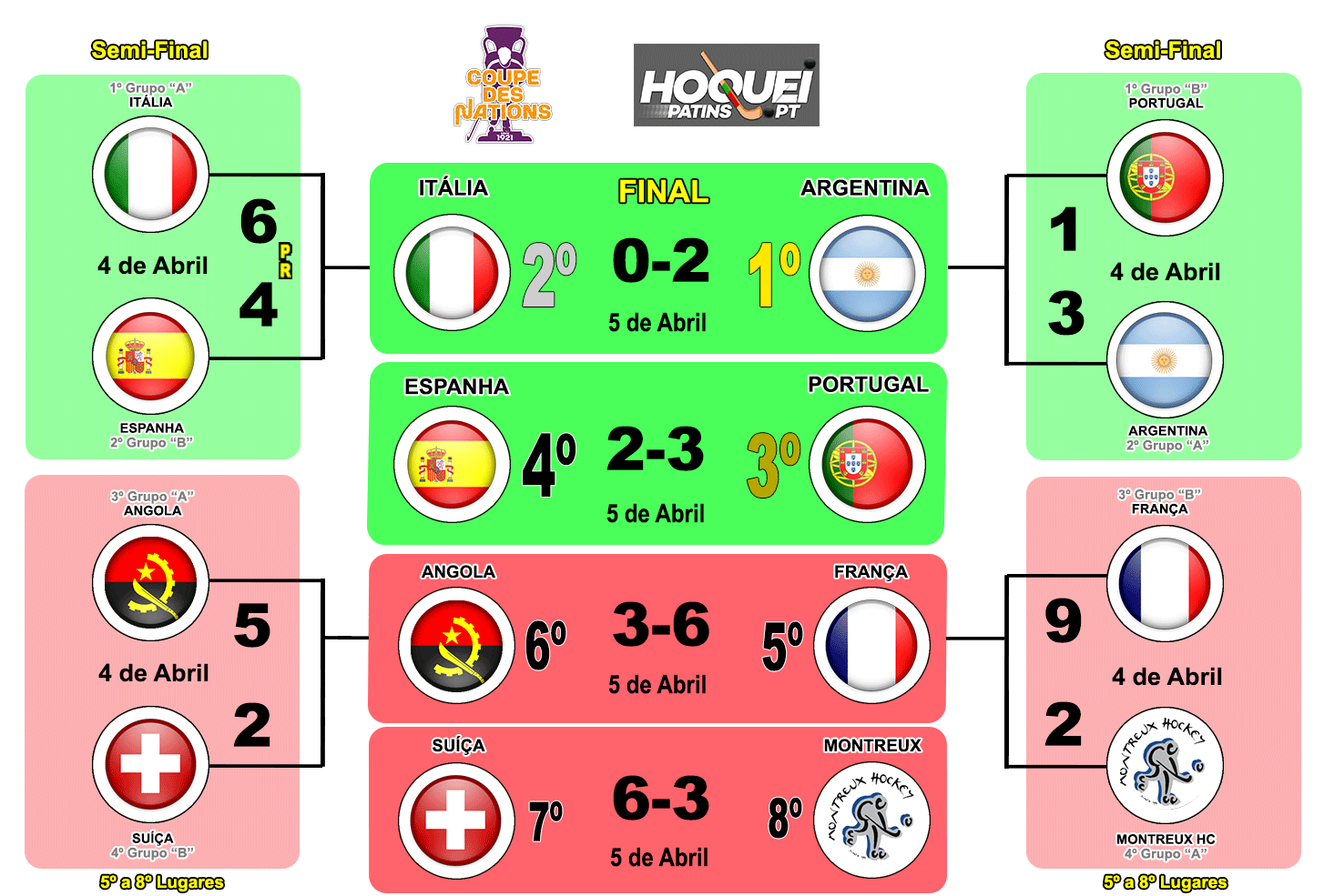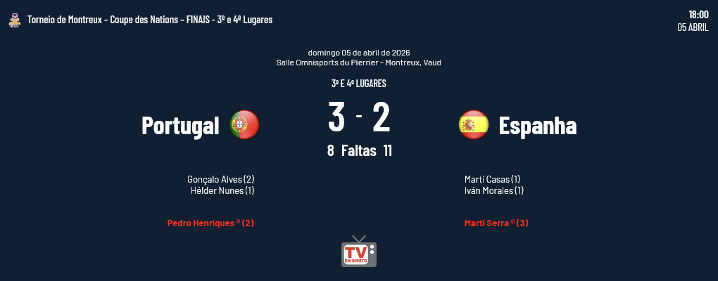 Portugal venceu a Espanha por 3-2 no jogo de disputa do 3º lugar do Torneio de Montreux (Coupe des Nations 2026) realizado na Salle Omnisports du Pierrier (Montreux, Suíça), terminando este importante torneio de preparação do Campeonato Mundial na 3ª Posição atrás da Itália, derrotada pela Argentina na Final.