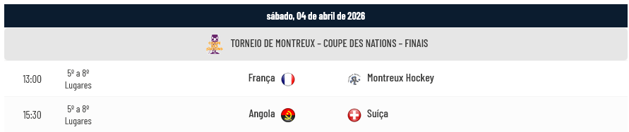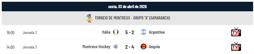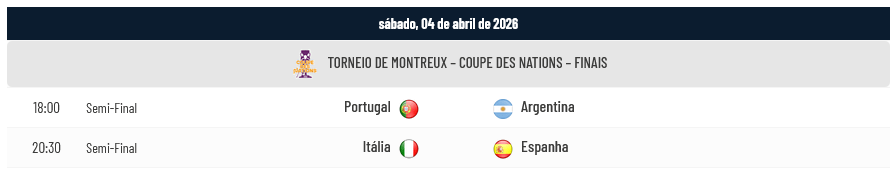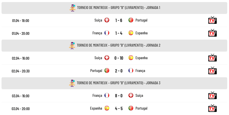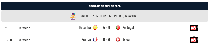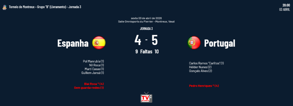 Portugal venceu a Espanha por 5-4 na 3ª e última Jornada do Grupo “B” do Torneio de Montreux (Coupe des Nations 2026) em jogo realizado na Salle Omnisports du Pierrier (Montreux, Suíça), garantindo desta forma o 1º Lugar do Grupo “B” e a disputa com a Argentina numa das Semi-Finais. Na outra Semi-Final, Itália e Espanha disputam o acesso à Final.