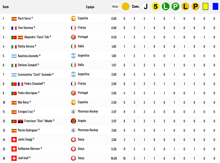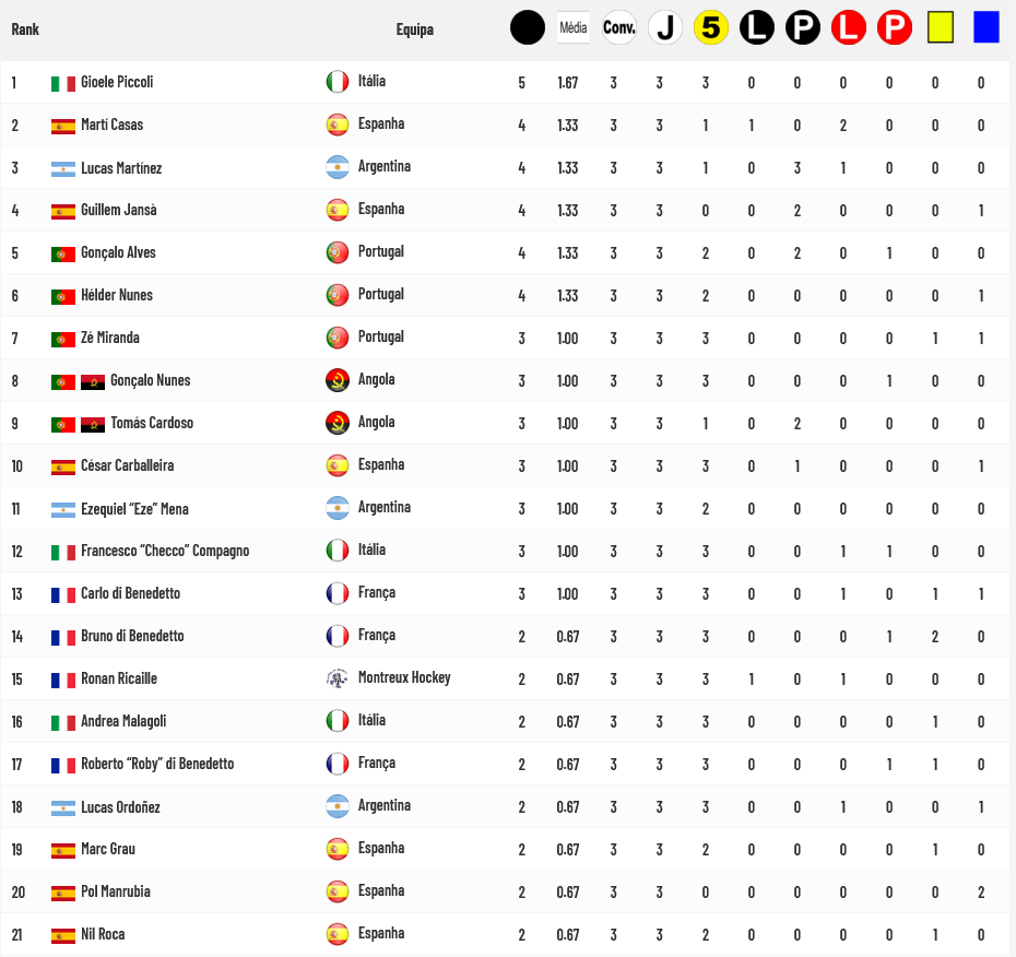Gioele Piccoli é o melhor Goleador da competição com 5 golos marcados perseguido por um grupo de 5 jogadores, entre os quais Gonçalo Alves e Hélder Nunes:
