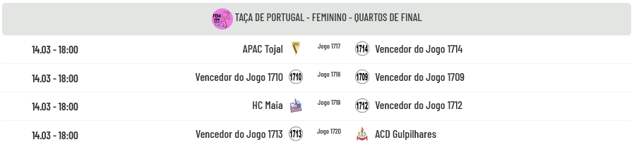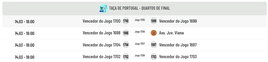 Os jogos da próxima eliminatória, os Quartos de Final, são os seguintes: