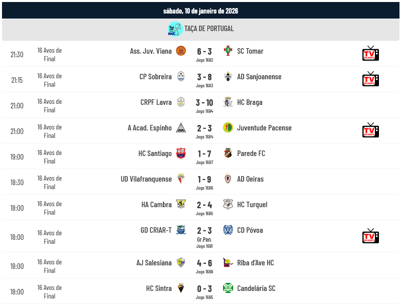 Realizaram-se no fim de semana passado os jogos dos Dezasseis Avos de Final da Taça de Portugal com apuramento de quase todas as equipas do Campeonato Placard, exceção feita à UD Oliveirense que foi batida pelo CD Paço de Arcos por 4-3 nas Grandes Penalidades. Abaixo apresentamos os resultados: