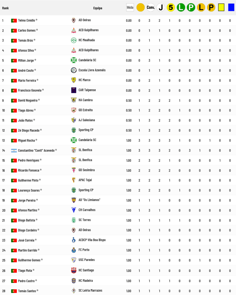 São oito os Guarda-Redes que ainda não foram batidos na competição. Siga a ligação apensa à tabela abaixo para consultar a lista completa dos Guarda-Redes: