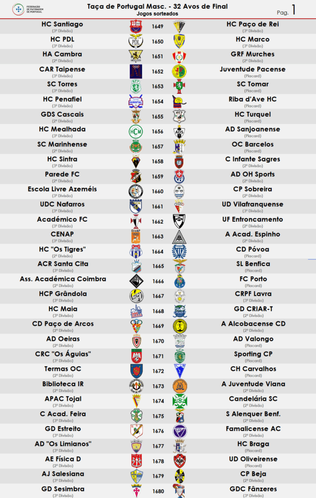 Realizou-se hoje o sorteio dos 32 Avos de Final da Taça de Portugal (já com equipas do Campeonato Placard e 2ª Divisão Nacional) com os seguintes resultados:
