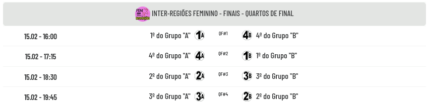 Os jogos dos Quartos de Final são os seguintes: