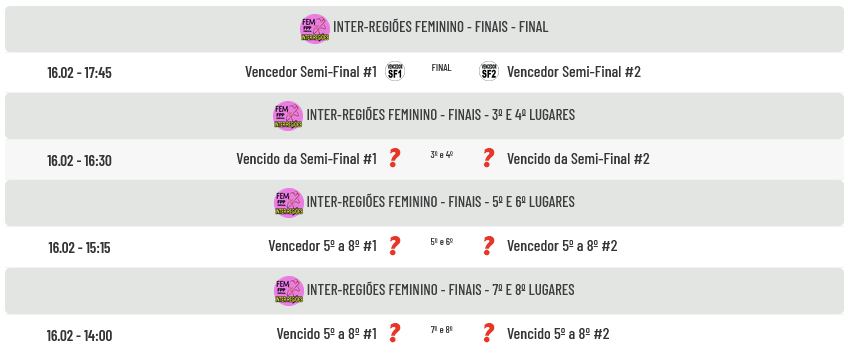 Finalmente na segunda-feira realiza-se a jornada final com os seguintes jogos: