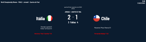 Na competição feminina, Portugal não teve grandes dificuldades em vencer a Alemanha por 5-1, garantindo um lugar na semi-final com a Argentina, que bateu a França por 10-1. Também a Espanha não teve quaisquer dificuldades em bater a Colômbia por 9-0 mas, já a Itália só conseguiu o passaporte no segundo final do jogo com o Chile de “Cata” Flores e “Maca” Ramos quando Elena Tamiozo marcou o 2-1 com o cronómetro mesmo a passar para o ZERO.