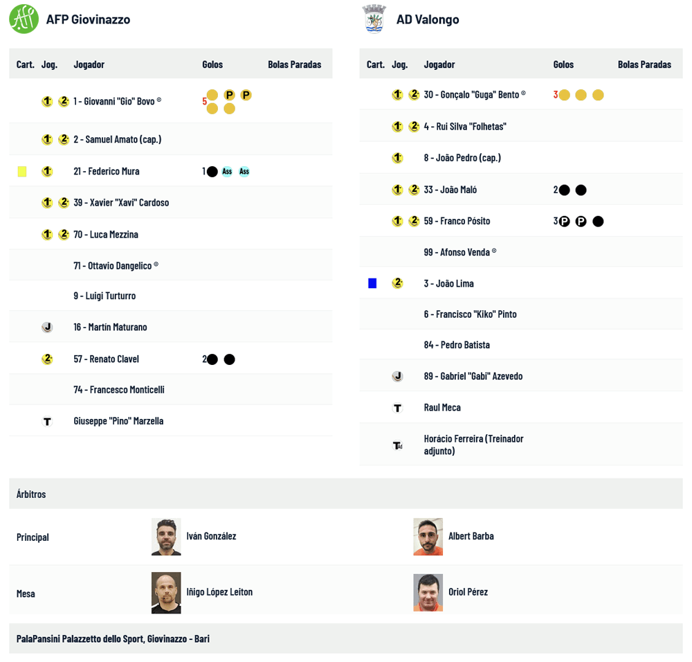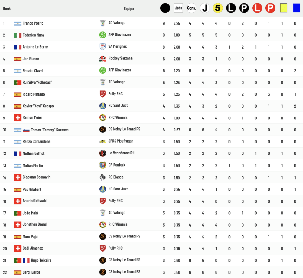 Franco Pósito foi, a par com Federico Mura, o Goleador desta prova, ambos com 9 golos marcados, e Rui Silva “Folhetas” aparece na lista do Top10 com 5 golos marcados. Conheça a lista completa a partir da ligação apensa à tabela abaixo: