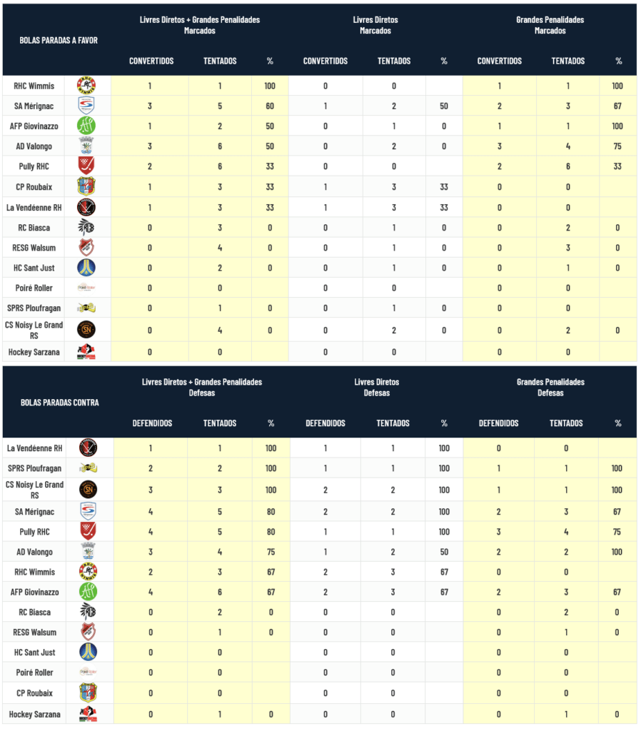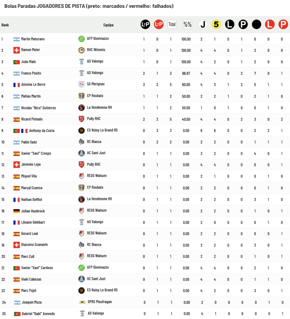 Os Jogadores de Pista do Valongo conseguiram 50% de sucesso nas tentativas de transformação das Bolas Paradas enquanto os seus Guarda-Redes defenderam 75% das situações a que foram sujeitos: