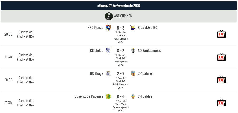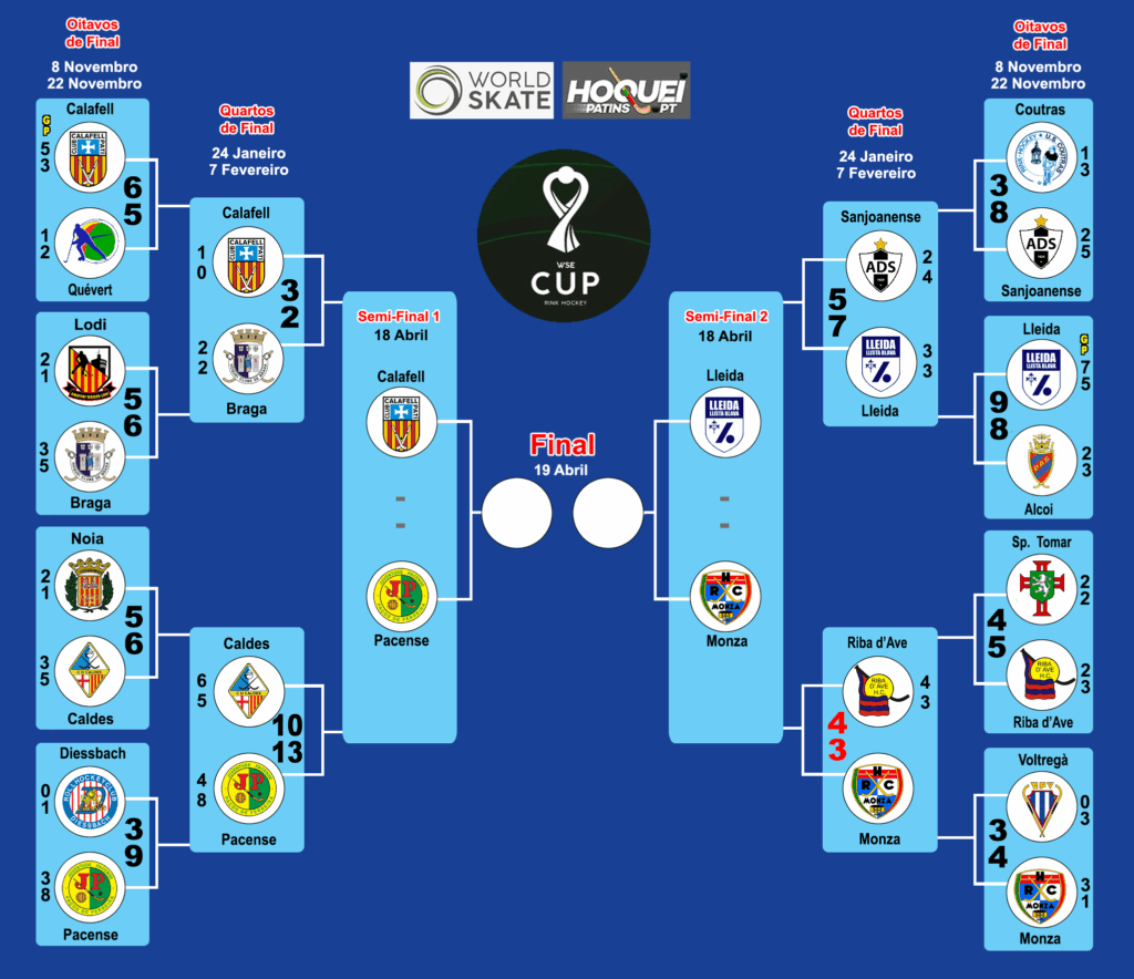 A Juventude Pacense venceu o Caldes (Espanha) por 8-4 conseguindo, desta forma, o apuramento para a Final Four da competição. O Riba d’Ave perdeu por 5-3 em Monza enquanto Braga e Sanjoanense empataram com os seus adversários não conseguindo, assim, os 3 clubes passar à Fase Final da prova devido aos resultados agregados: 2-3 para o Braga frente à forte equipa do Calafell de Guillem Cabestany, 5-7 para a Sanjoanense na disputa com o Lleida de Darío Giménez e 7-8 para o Riba d’Ave no confronto com o Monza. Vejamos os resultados dos jogos da 2ª Mão dos Quartos de Final do sábado passado:
