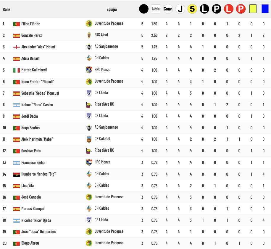 Filipe Flórido é, agora, o líder da tabela de goleadores da WSE Cup Men com 6 golos marcados perseguido por Gonzalo Pérez, “Alex” Mount e Adrià Ballart, todos com 5 golos marcados, seguidos por 8 jogadores com 4 golos marcados, entre os quais Nuno Pereira “Miccoli”, “Nanu” Castro, Hugo Santos e Gustavo Pato: