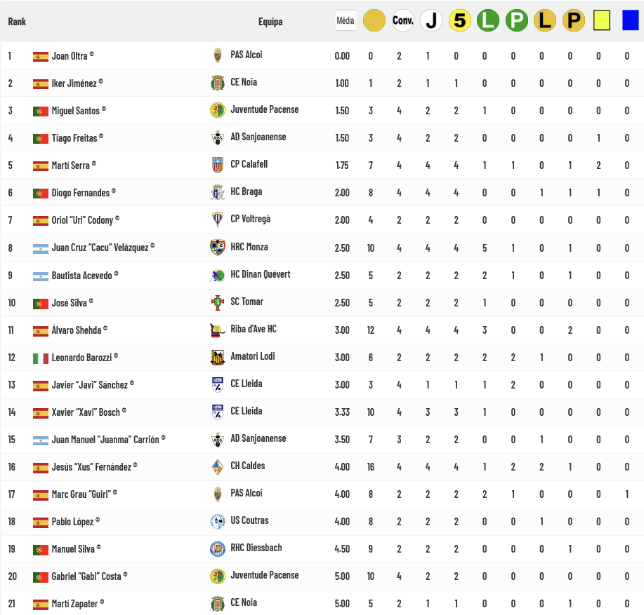 Joan Oltra é o líder da tabela de Guarda-Redes menos batidos da WSE Cup Men mas só participou num único jogo. São 5 os Guarda-Redes que apresentam média inferior a 2 golos sofridos por jogo e agora, para além de Oltra, são 4 guarda-redes média inferior a 2 golos sofridos por jogo, Iker Giménez, Miguel Santos, Tiago Freitas e Martí Serra: