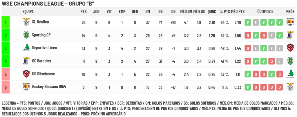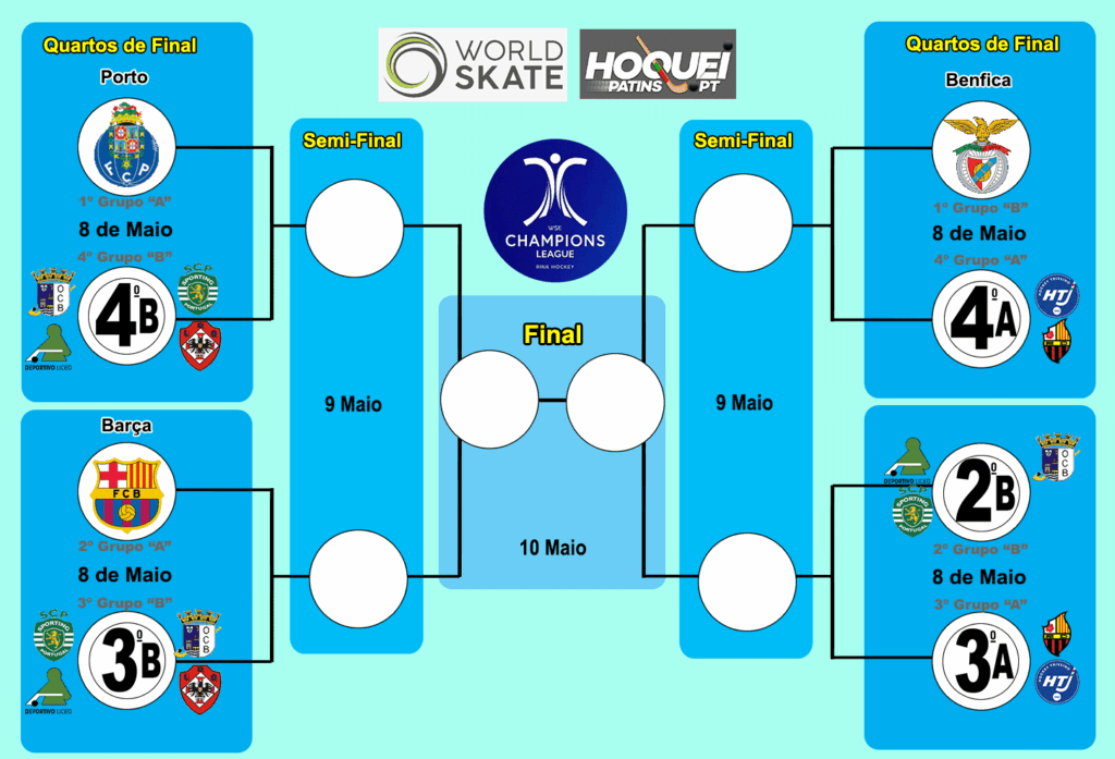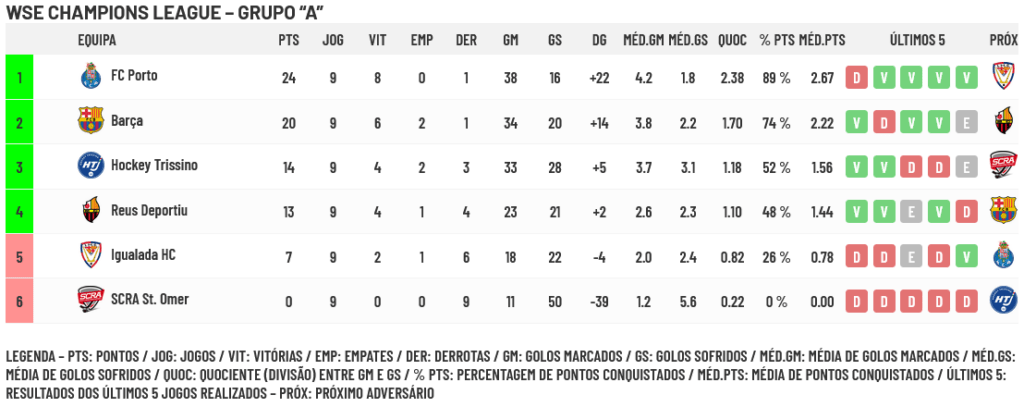 No Grupo “A” estão apurados já Porto (1º classificado), Barça (2º), Trissino e Reus, que ainda vão decidir quem fica em 3º e 4º lugares… Igualada (5º com 7 pontos) e SCRA (último com zero pontos) já não podem ser apurados.