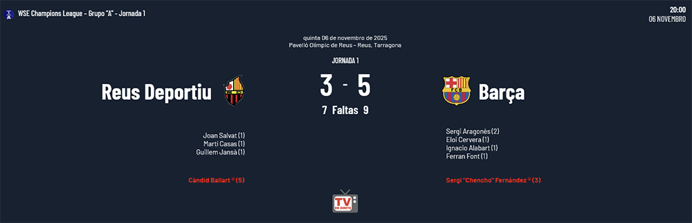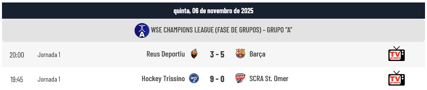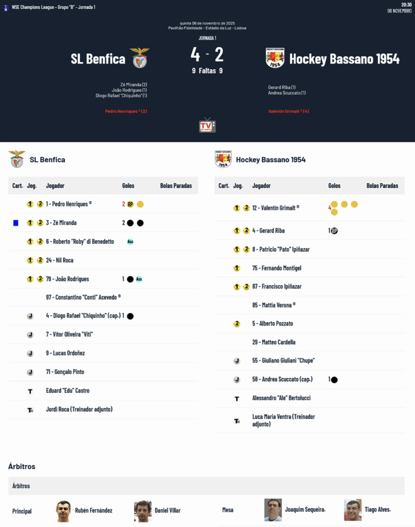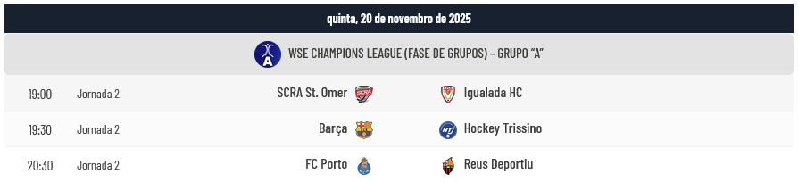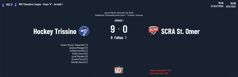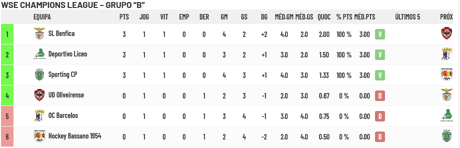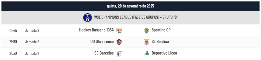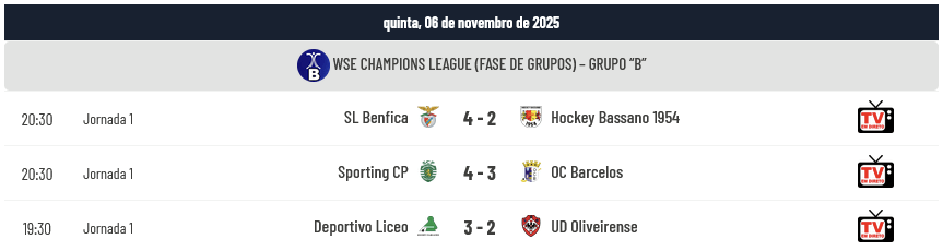 O Sporting CP e o SL Benfica venceram respetivamente OC Barcelos (4-3) e Bassano Hockey (4-2) para arrancarem da melhor maneira a edição 2025-26 da WSE Champions League. A Oliveirense perdeu por 3-2 com o Liceo na Corunha enquanto o Porto tinha já vencido o Igualada por 3-1 na quarta-feira. No grande derby espanhol, o Barça foi a Reus vencer por 5-3 enquanto em Itália o Trissino de João Pinto “Mustang”, João Almeida, “Alvarinho” e Guilherme Silva goleou o SCRA por 9-0.
