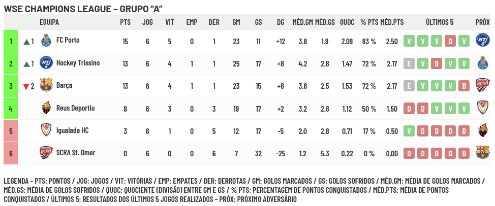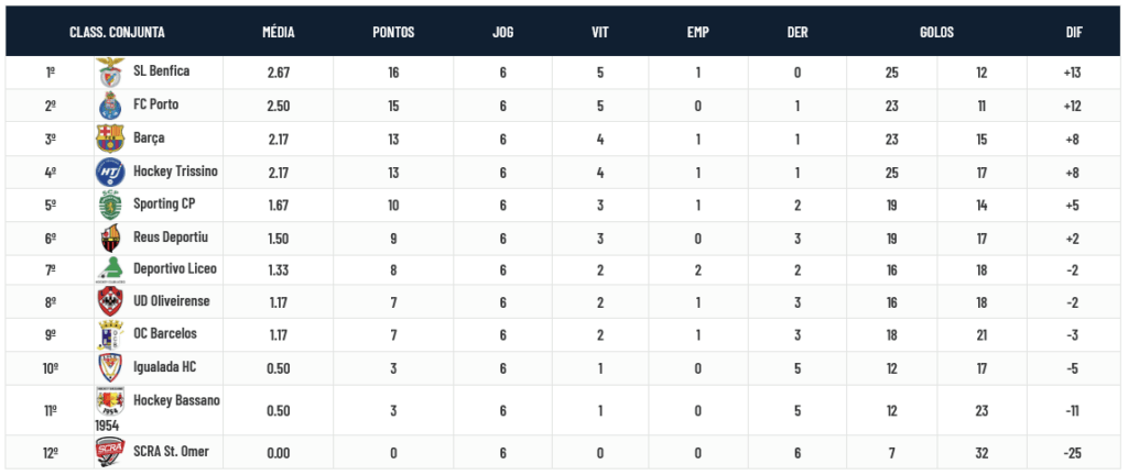 O Benfica é a equipa que mais pontos obteve nas 6 primeiras jornadas da Fase de Grupos mas Porto, Barça e Trissino também conseguiram, em média, mais de 2 pontos por cada jogo realizado…