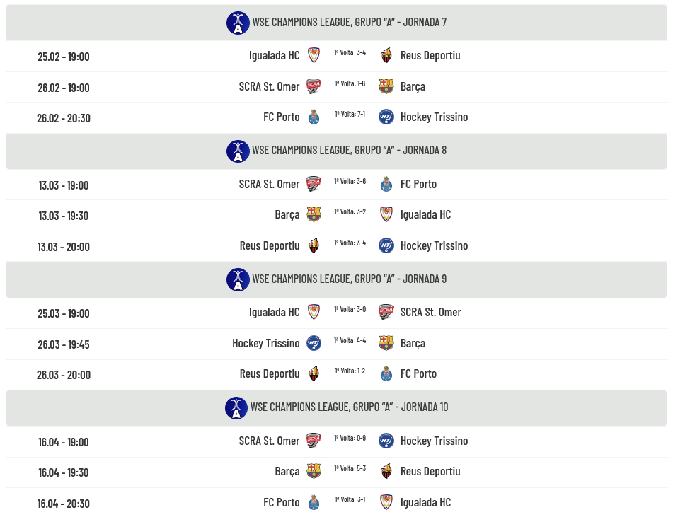 O Porto deslocou-se a Barcelona e conseguiu uma brilhante vitória não dando ao “todo-poderoso” Barça hipóteses de marcar qualquer golo no Palau Blaugrana, saltando de novo para a liderança do grupo, agora com 2 pontos de vantagem sobre o Trissino que venceu o Igualada e ultrapassou o Barça para ocupar o 2º lugar da tabela classificativa. O Reus bateu com alguma previsibilidade o SCRA e mantém o 4º lugar (que o apura para a Final8) mas, mais importante ainda, afastando-se do 5º lugar do Igualada, agora com 6 pontos de diferença.