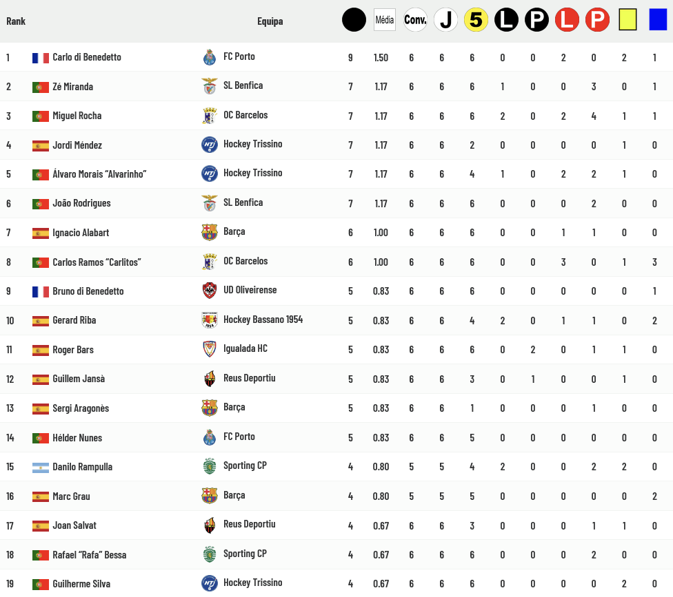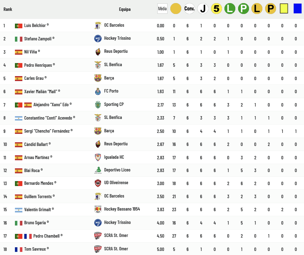 Luís Belchior é agora o único guarda-redes que ainda não sofreu golos (um jogo realizado) e Stefano Zampoli é o segundo da lista com 1 golo sofrido (média de meio golo sofrido por jogo). Nil Viña, Pedro Henriques, Carles Grau e “Xavi” Malián apresentam médias inferiores a 2 golos sofridos em cada jogo realizado…