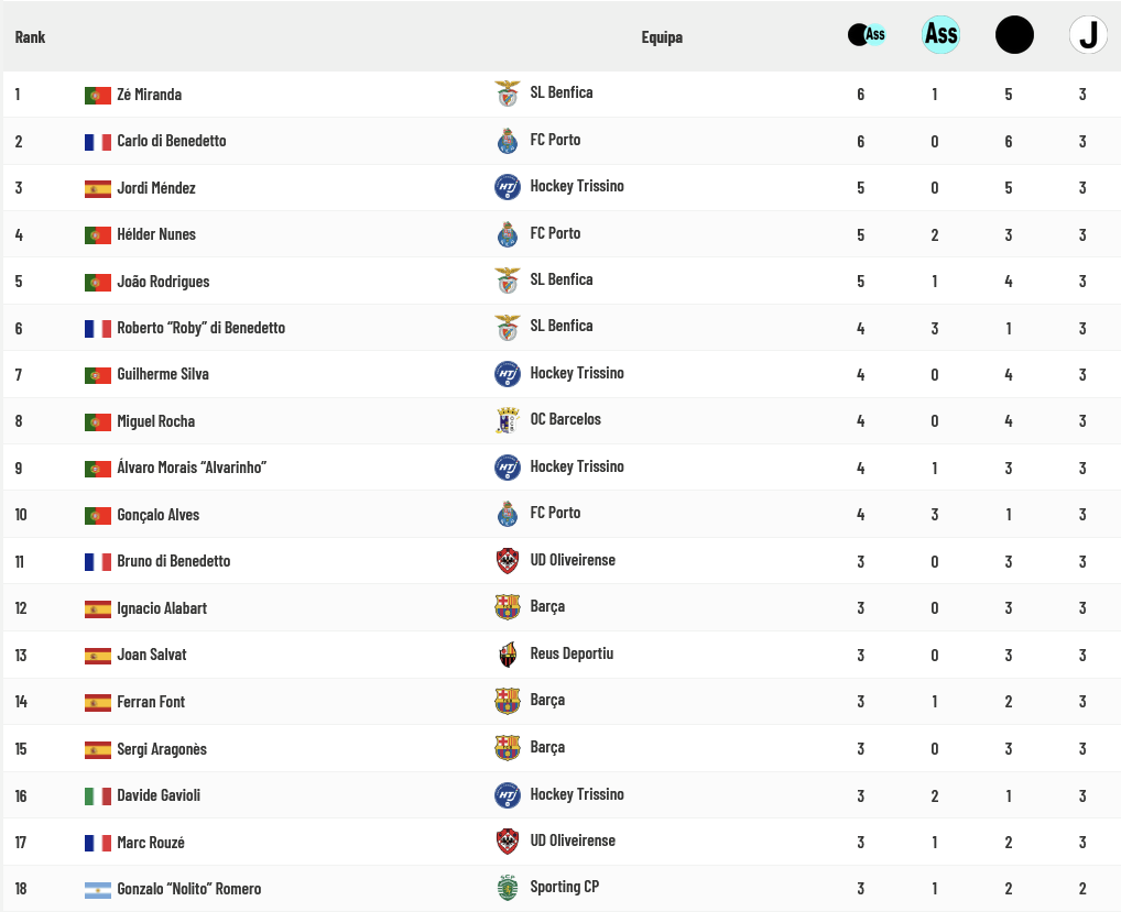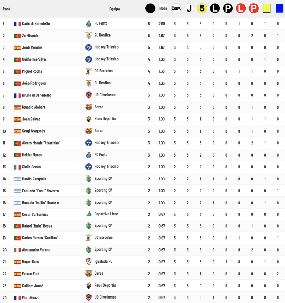 Zé Miranda e Carlo Di Benedetto lideram a lista de participações ativas em golos das suas equipas (golos marcados e assistências para golo) enquanto Jordi Méndez, Hélder Nunes e João Rodrigues ocupam lugares nos 5 primeiros da lista que conta ainda com 9 jogadores portugueses ou a jogar em Portugal nos 10 primeiros lugares: